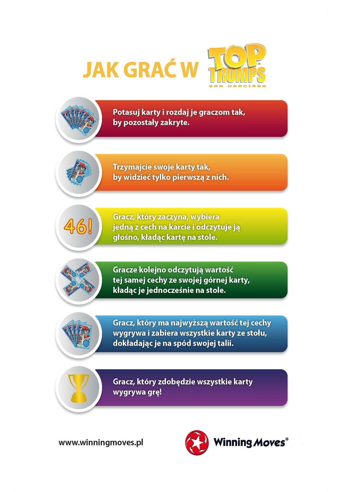 Top Trumps byly založeny před více než půl stoletím. Jedná se o lehkou a zábavnou karetní hru pro celou rodinu. Pravidla jsou velmi jednoduchá. Potřebujeme alespoň dva hráči mezi které rozdělíme zamíchané karty. Každá z nich má 5 různých charakteristik definovaných číselnou hodnotou. Podíváme se na první kartu a hráč po rozdávajícím vybere, kterou vlastnost budeme porovnávat. Kdo má nejvyšší hodnotu pro danou vlastnost, získá všechny karty. Hra pokračuje, dokud všechny karty nepřipadnou jednomu hráči, který se stává vítězem. Sada obsahuje 33 karet v praktickém plastovém balení, které vám umožní vzít si je kamkoli s sebou.