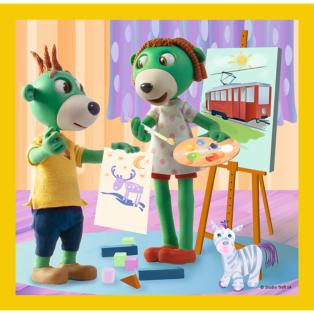- Trefl 34850 Puzzle 3v1 Rodina Treflíkových Společně je veselo se skládá ze 3 samostatných obrázků o velikosti 20 x 19,5 cm. Množina má 106 prvků.