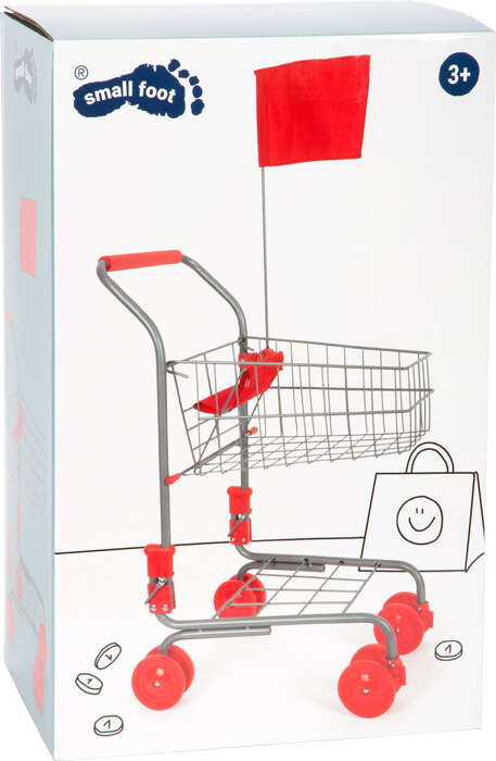Dětský nákupní vozík s červenými akcenty a vlajkou je skvělým dárkem pro batolata, která si ráda hrají na obchod. S vozíkem budou moci hrát nejen roli prodavače, ale také zákazníka při hře na obchod. Výška vozíku včetně vlajky je 98 cm.