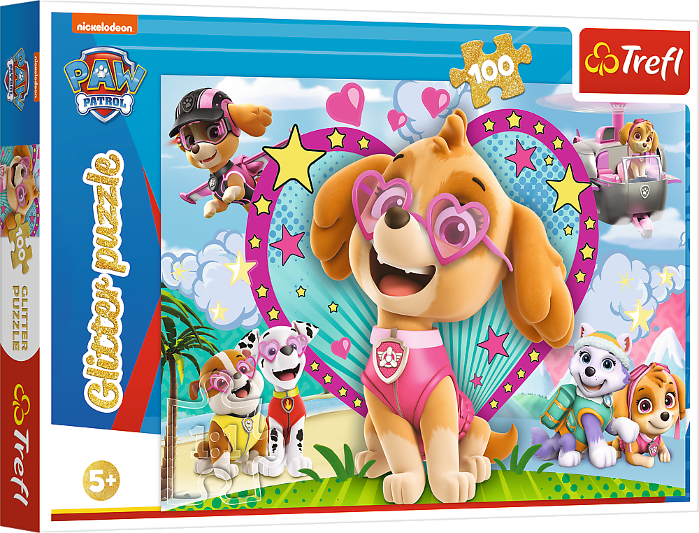 • Sada skládaček "V záři Skye" o 100 dílcích, zdobená třpytkami , s vyobrazením postaviček z Psí hlídky.