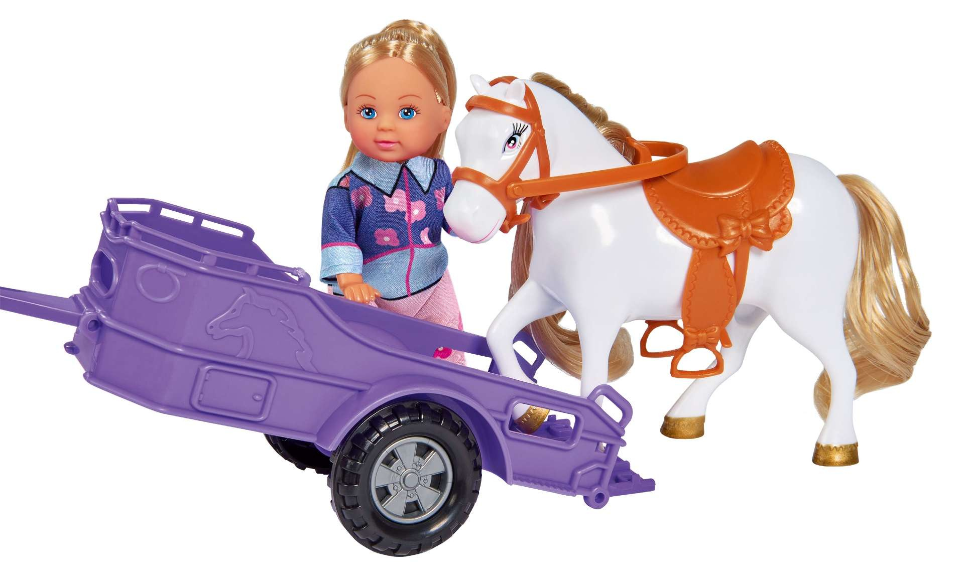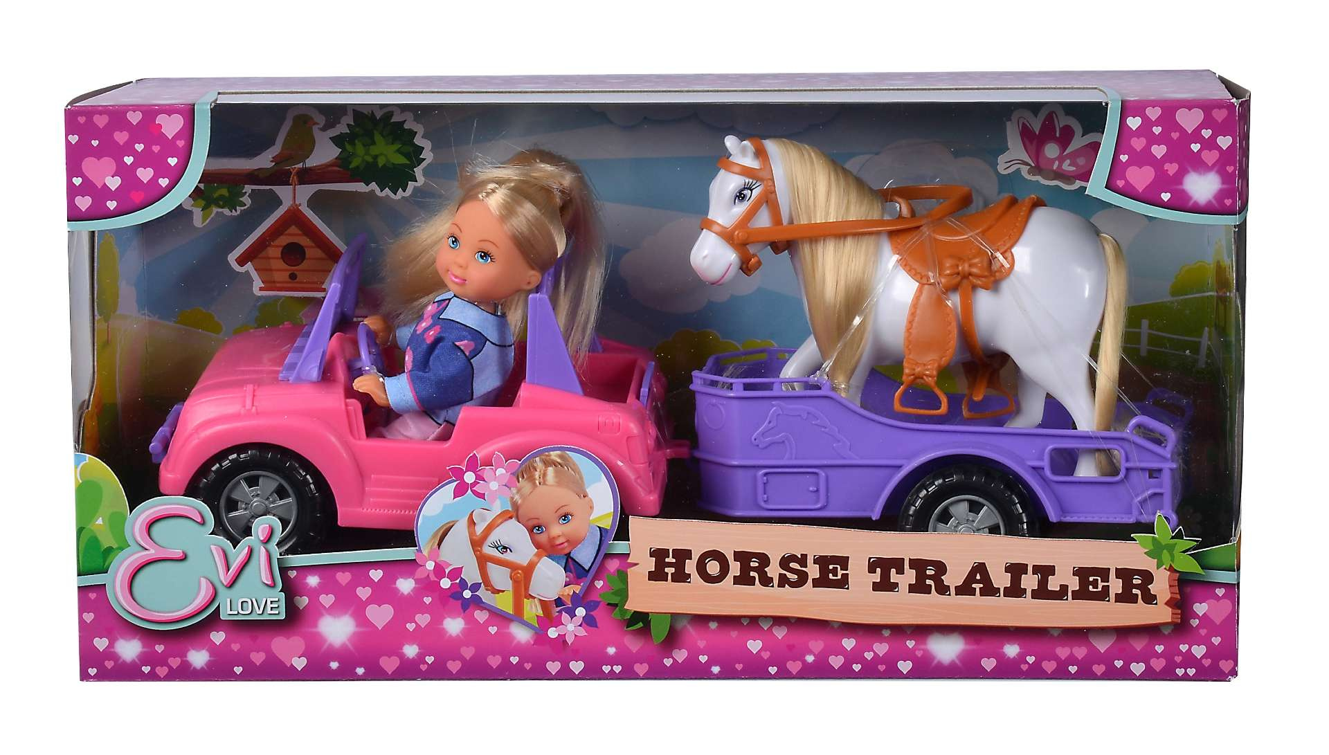 Panenku lze uložit do džípu, připojit k přívěsu s koněm a vzít ho na projížďku. Kůň má sedlo, třmeny a hříbě. Panenka je oblečena do růžového fleecu a kostkovaných kalhot. Evi lze nasadit na koně.