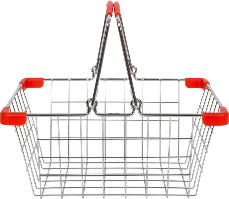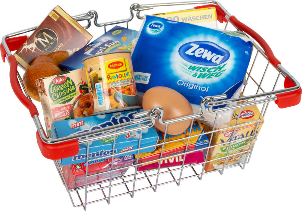 Sada obsahuje známé potravinářské výrobky v kartonech, plechovkách a lahvích a kovový koš.