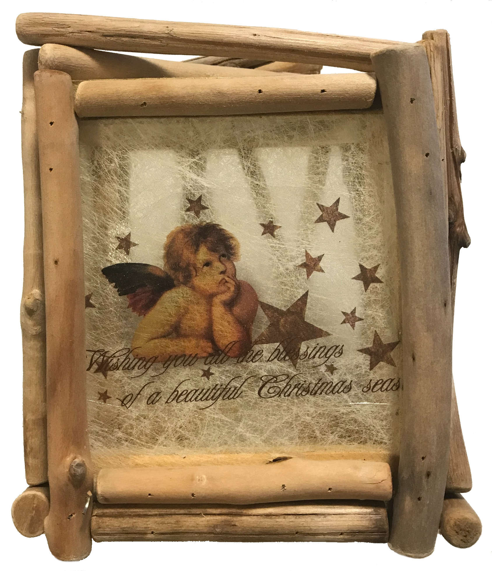 • Dřevěná lucerna na baterie s obrázkem anděla.