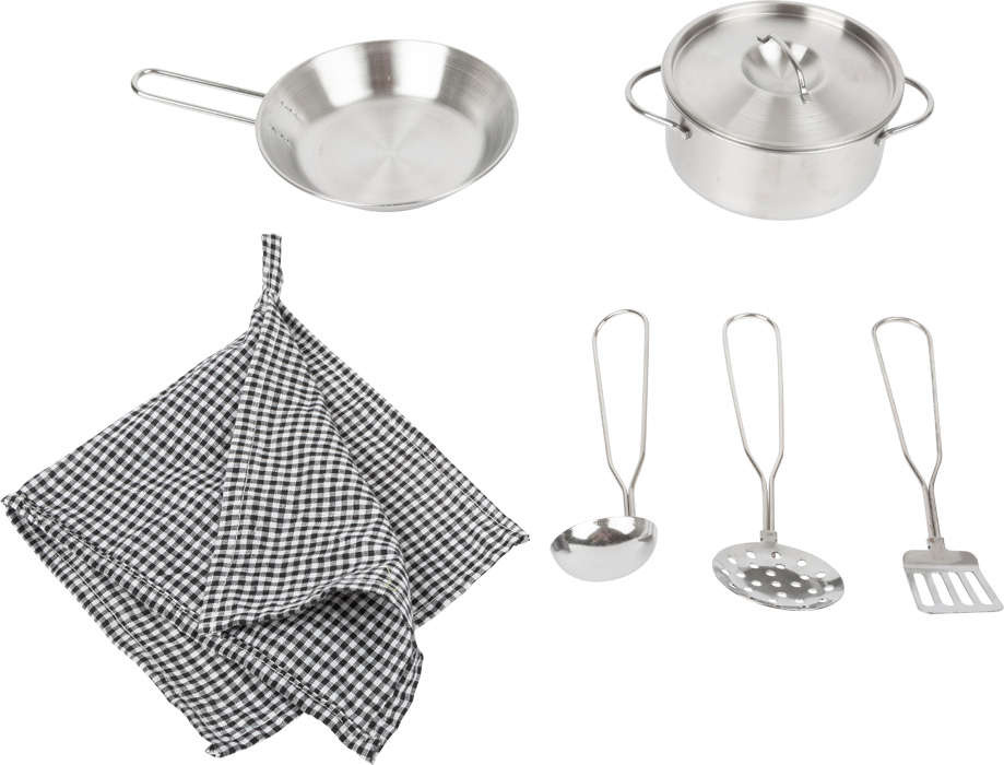- četné příslušenství: utěrka, pánev, hrnec s poklicí, špachtle, odkapávací lžíce, naběračka.