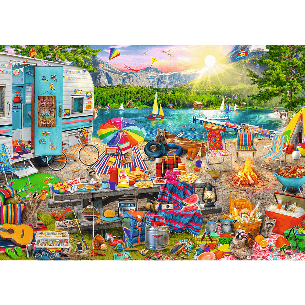Sada skládaček se skládá z 1003 dílků a umožňuje sestavit mimořádně pestrý obrázek prezentace letní kempování u jezera.