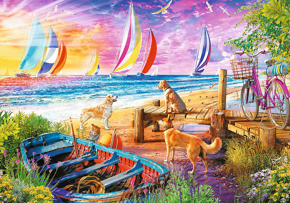 - Sada se skládá z 1000 dílků a umožňuje vytvořit krásný obrázek s pohledem na plachetnice a psy na molu a písku.