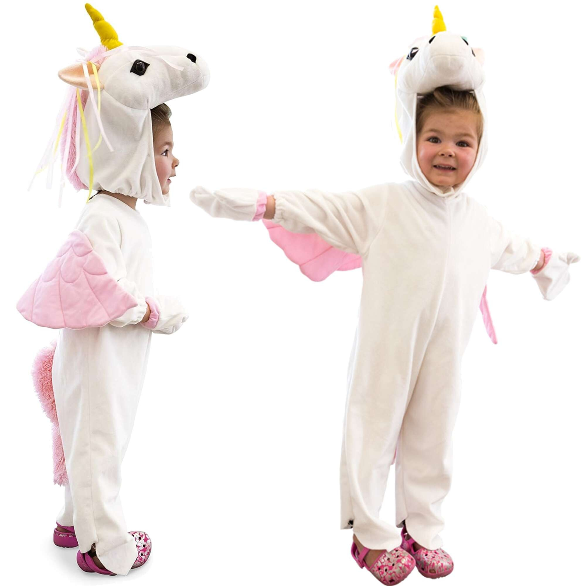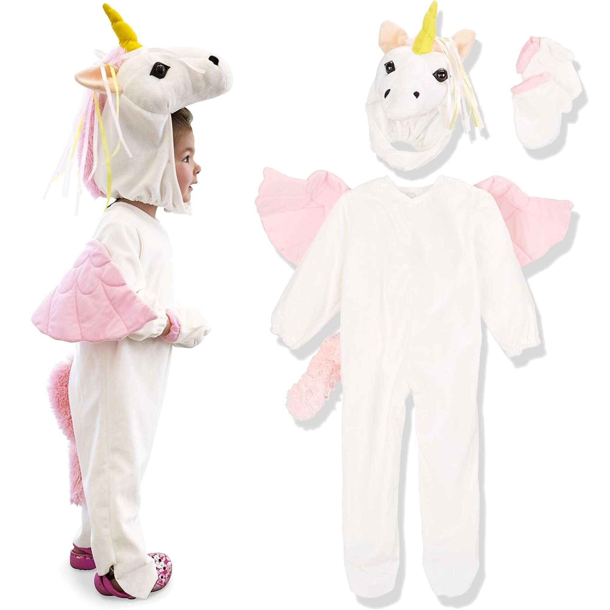 - Kostým je velmi roztomilý a vypadá jako jednorožec. Je vyroben z bílého materiálu, který je příjemný na dotek. Na zadní straně kostýmu jsou křídla a ocas. Součástí kostýmu jsou rukavice a hlava jednorožce.