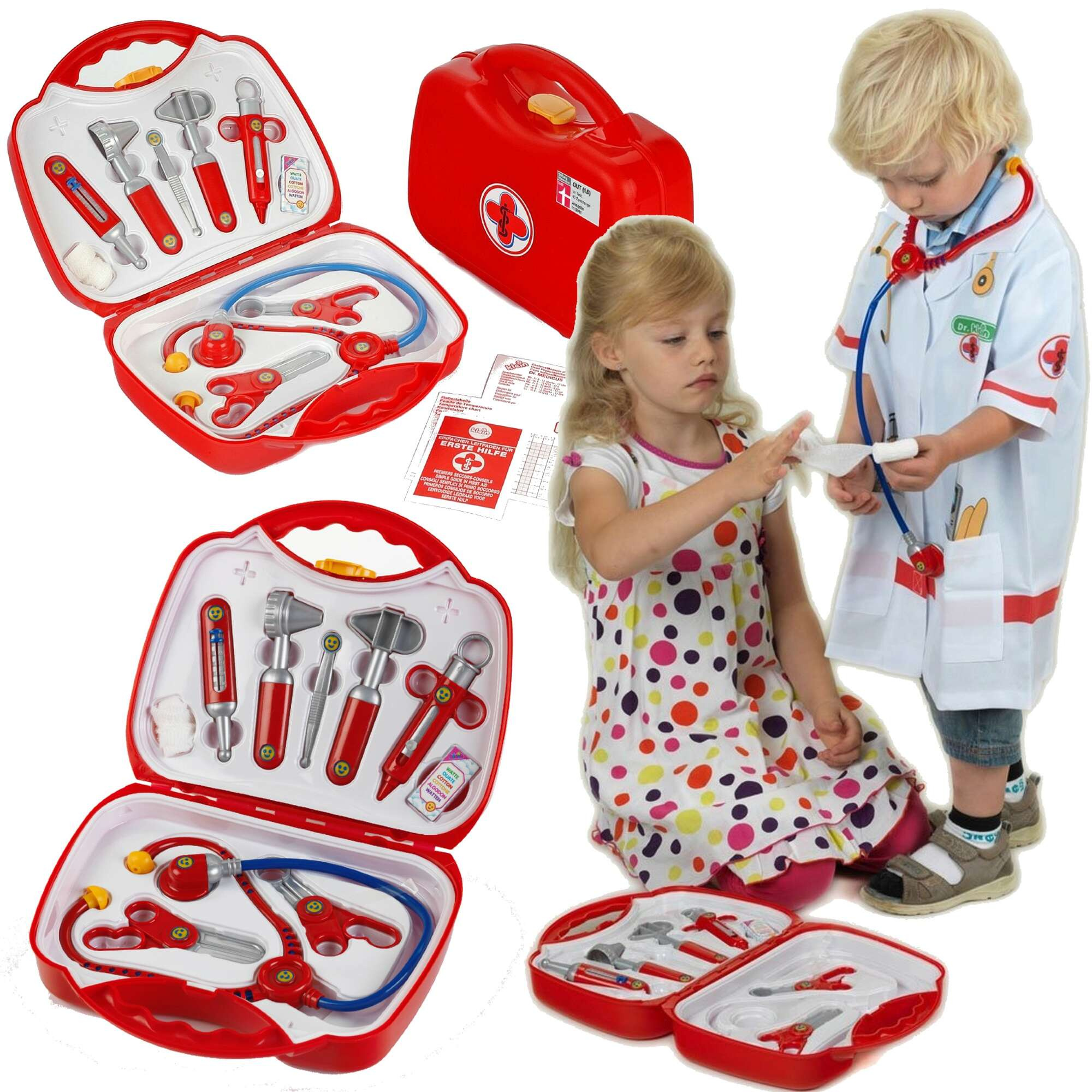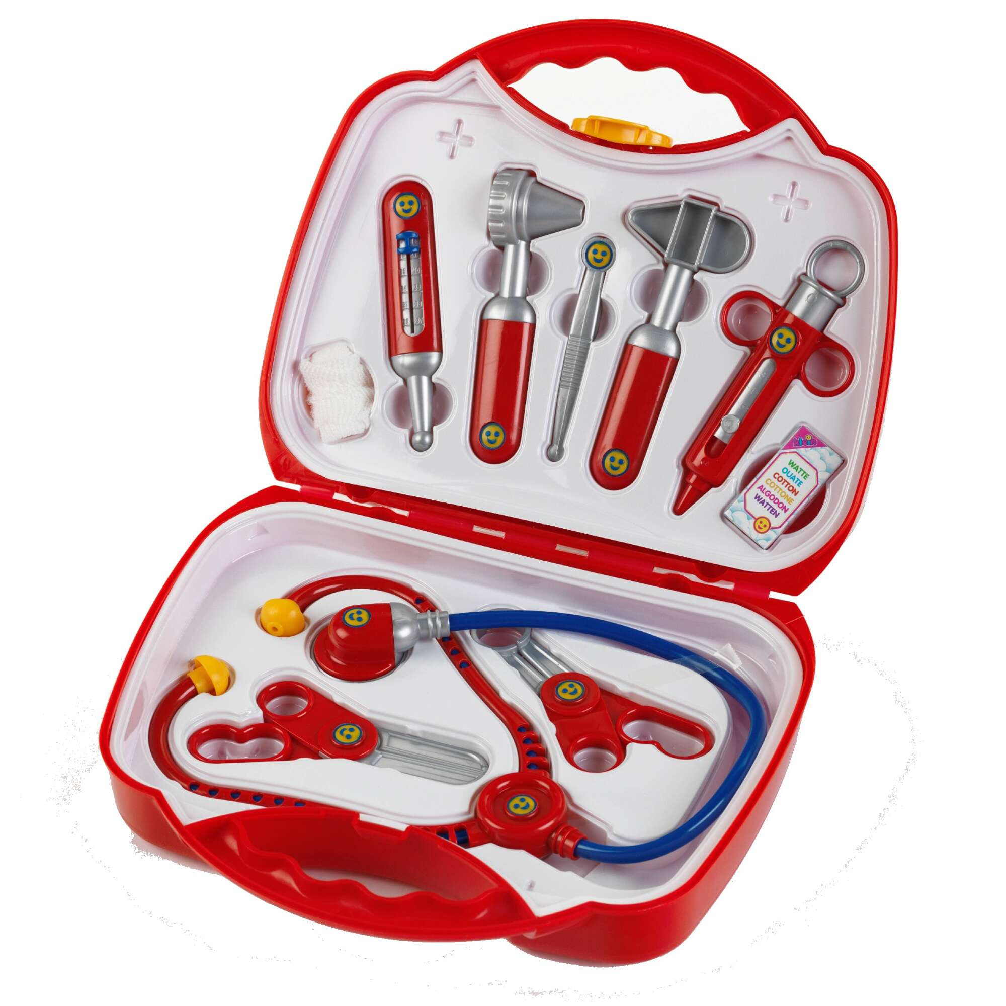 Přiložené lékařské nástroje jsou v červené a stříbrné barvě a zdobí je žlutý smajlík. Jsou to zcela bezpečné pro děti, žádné ostré hrany, vyrobeno s velkou přesností a robustností. Takto budou vašemu dítěti sloužit dlouhou dobu.