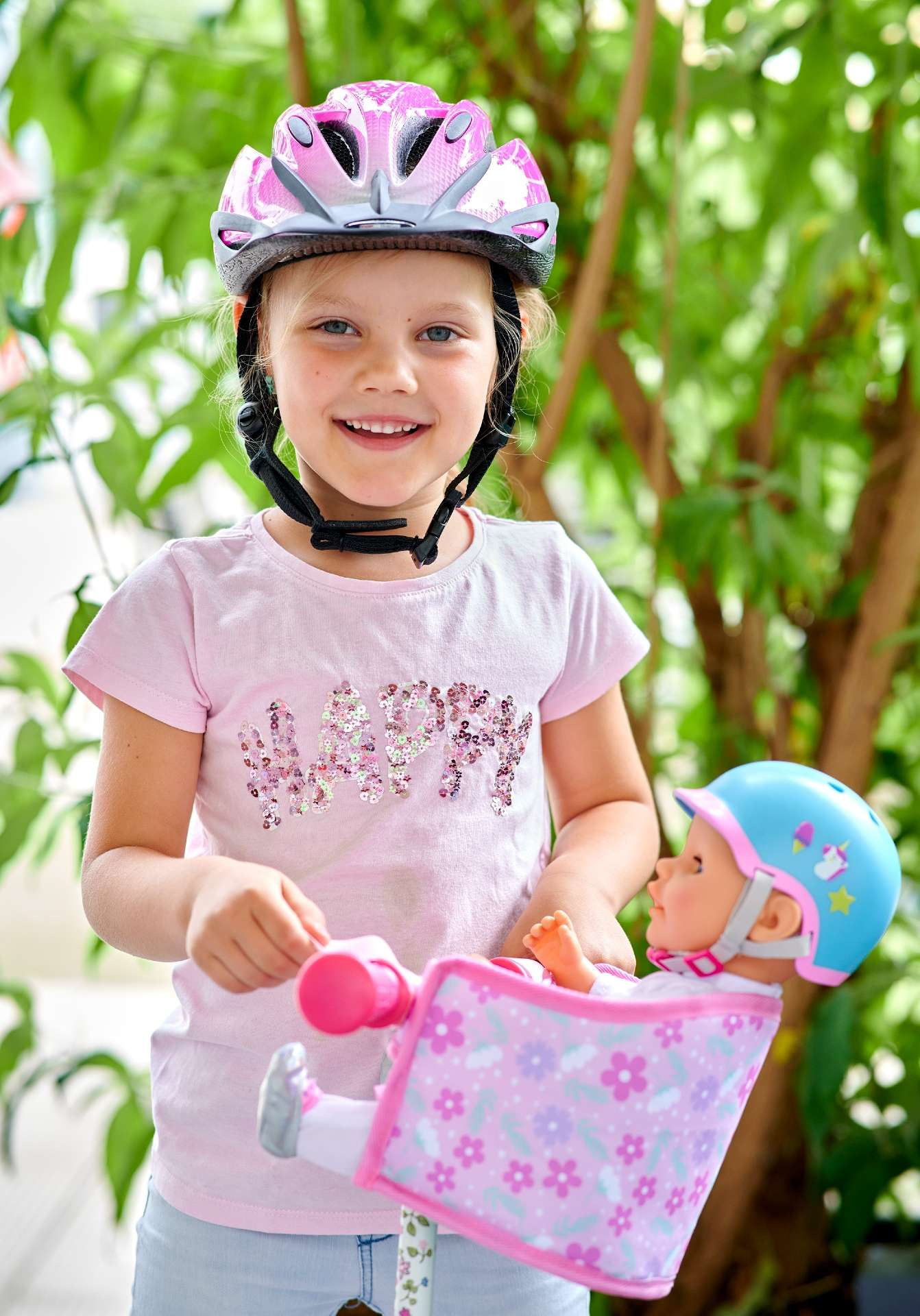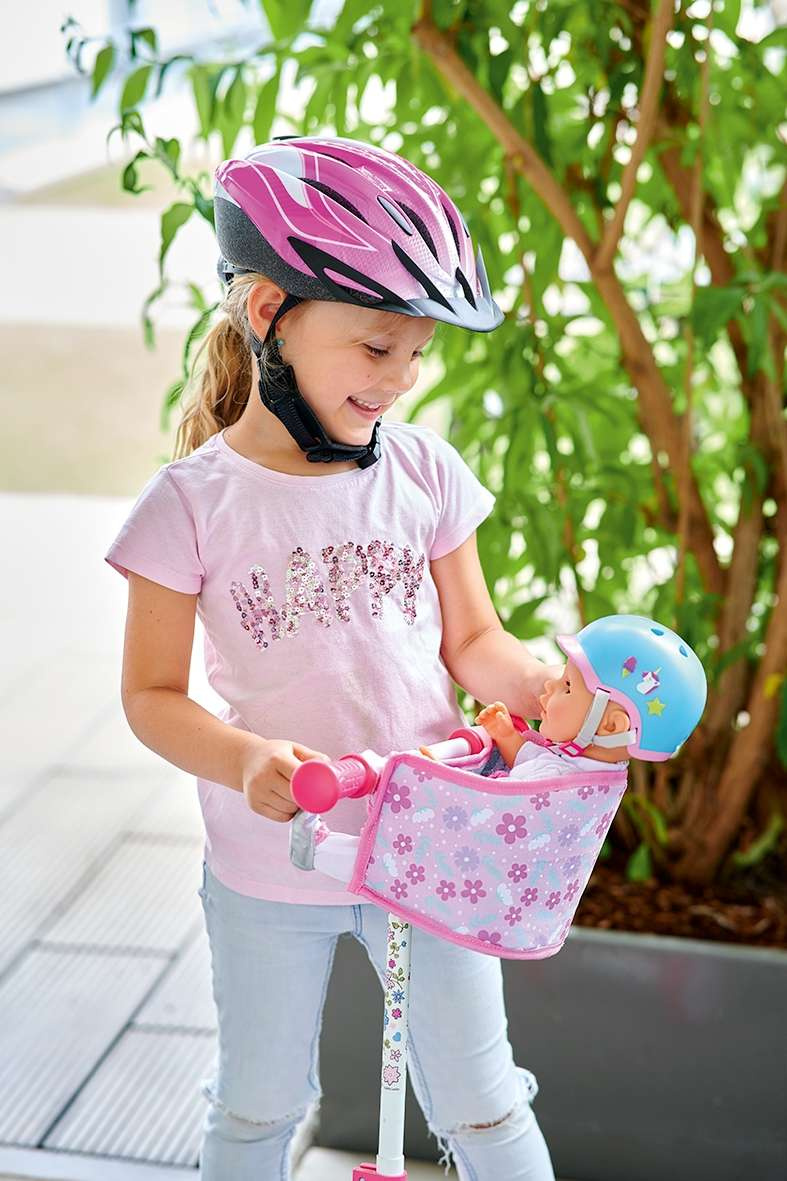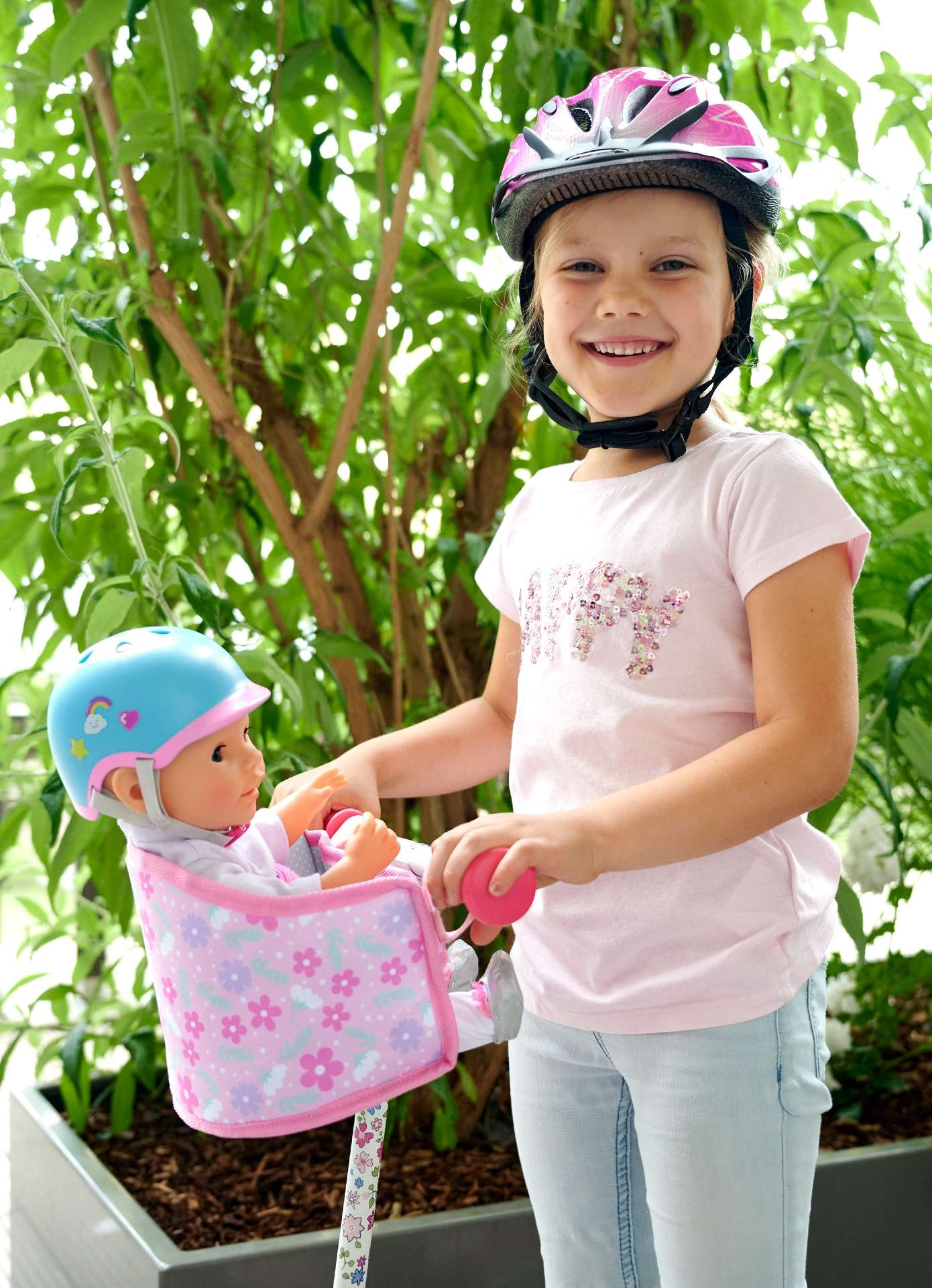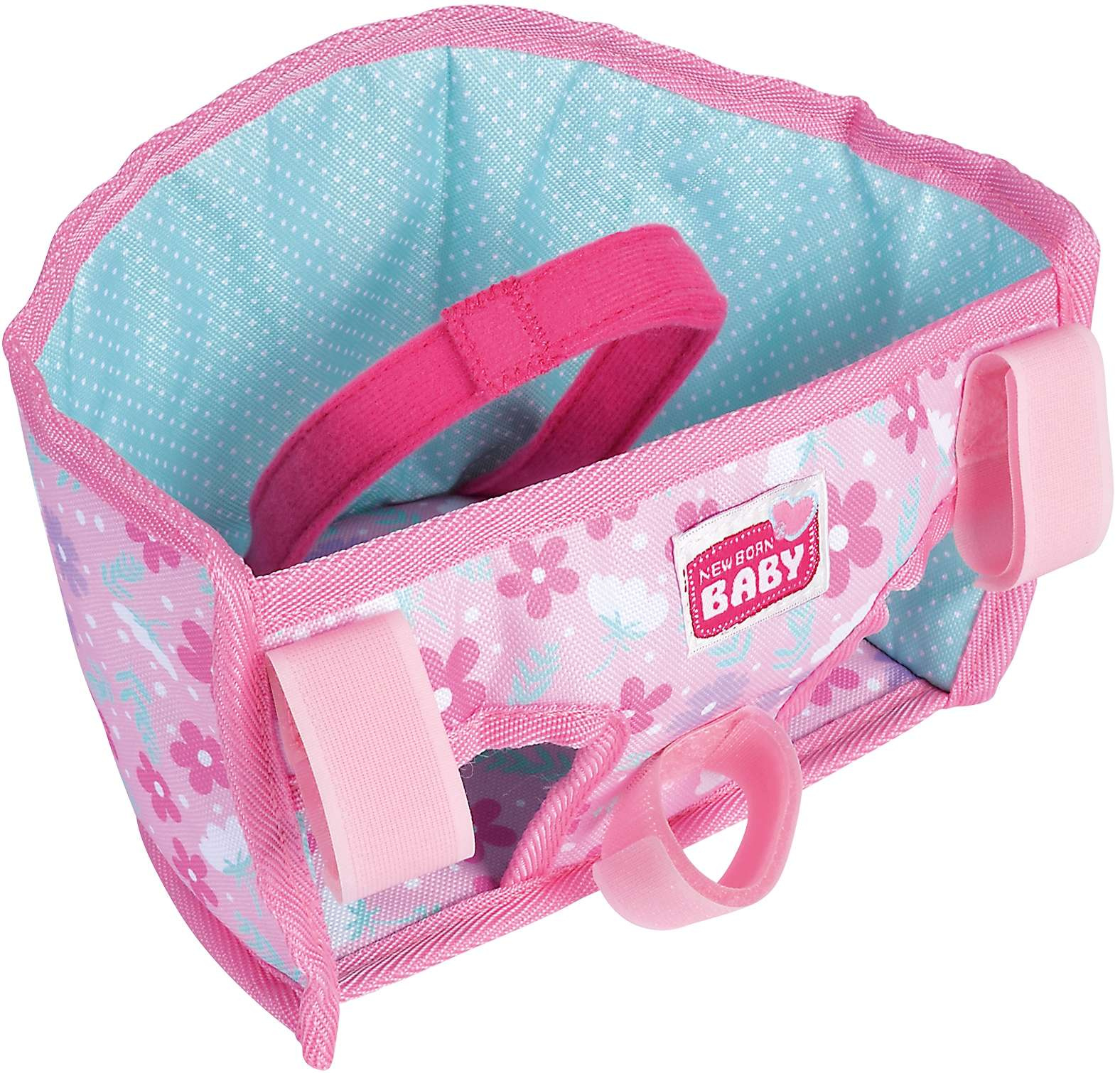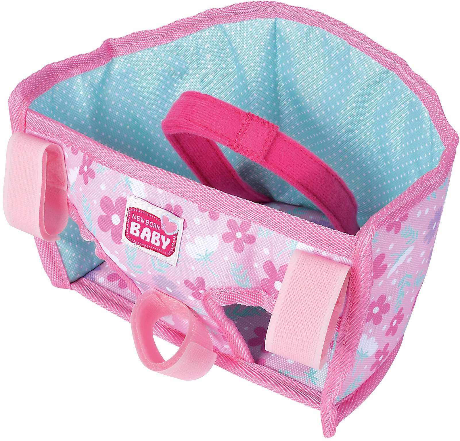 - Sedátko pro panenku je v růžové barvě s květinovým vzorem. Má všité bezpečnostní popruhy. Sedačku lze připevnit k dívčímu kolu nebo koloběžce pomocí suchých zipů. Je vhodné pro panenky s výškou 30-43 cm.