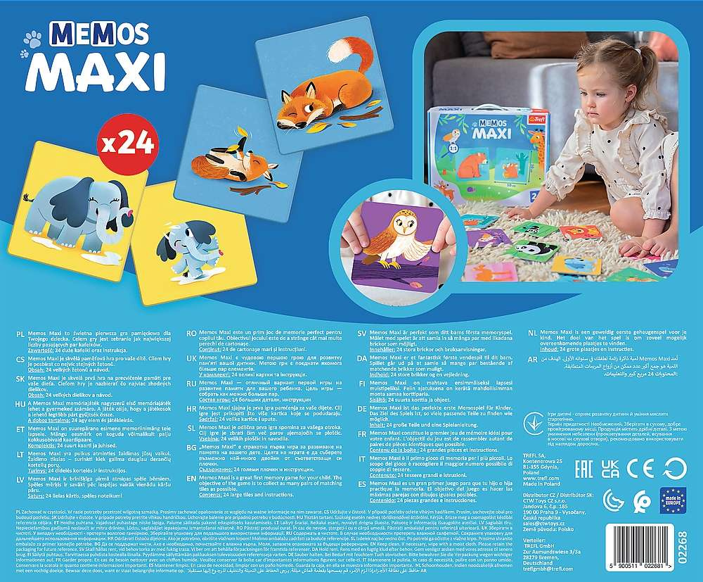 - Memos Maxi je paměťová hra navržená s ohledem na nejmenší děti. Úkolem hráče je spojit všechny destičky, které jsou krásně ilustrované a mají barevné obrázky roztomilých zvířátek a jejich mláďat, do dvojic