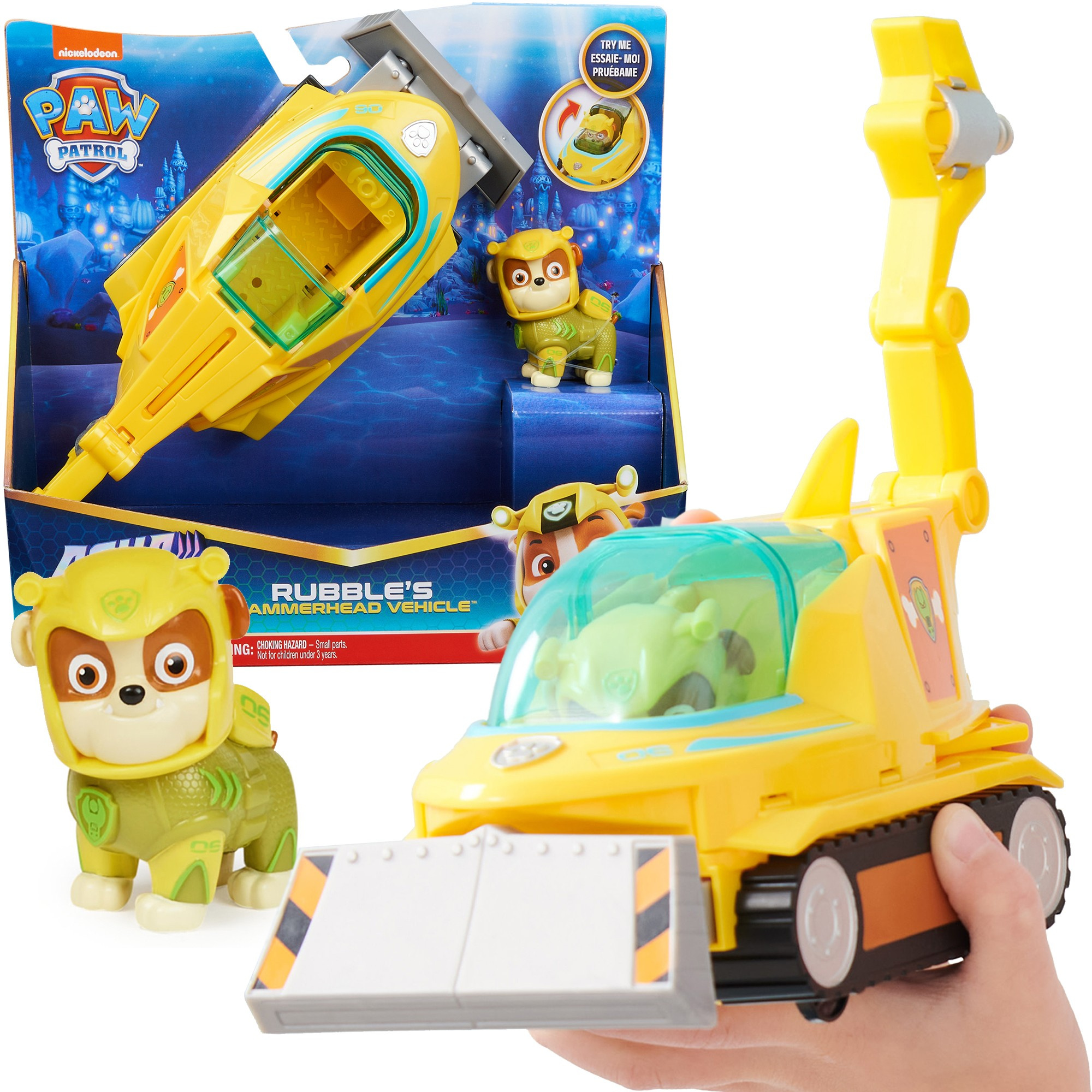 • Rubble je anglický buldok a v seriálu hraje roli řidiče stavebního stroje. Sada obsahuje kromě psa i vozidlo - ponorku, která vypadá jako ryba kladivoun.