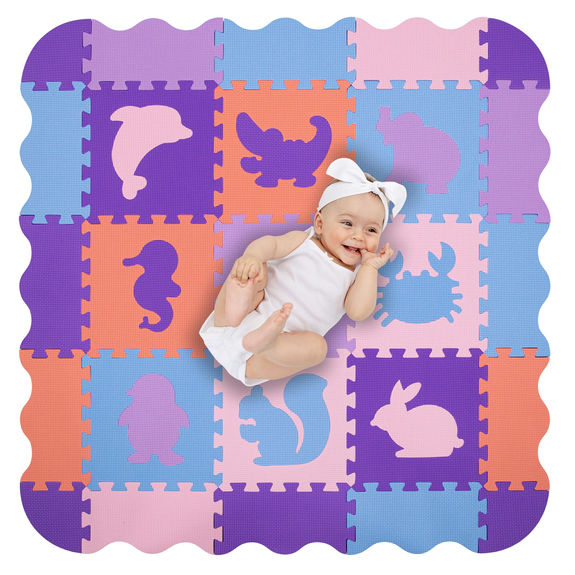 Humbi Vzdělávací podložka 120 x 120 cm Hrací deka Silné pěnové puzzle 30 x 30 cm Zvířata Barva růžová fialová pastelová modrá