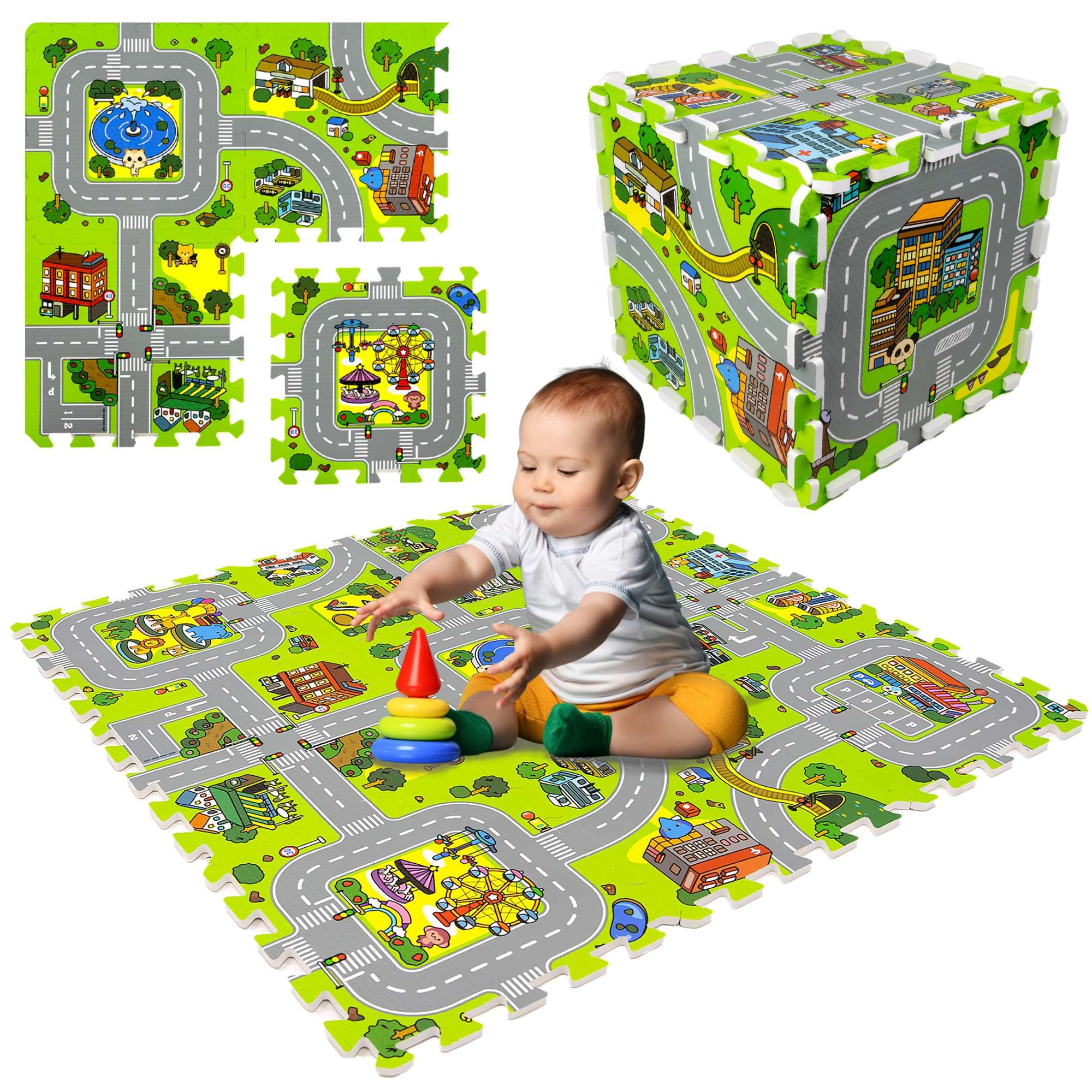 - Sada 9 dětských pěnových skládaček o rozměrech 31,5 x 31,5 x 1 cm. Puzzle lze spojovat do podložky nebo kostky. Hádanky jsou zdobeny grafikou zobrazující město s ulicemi.