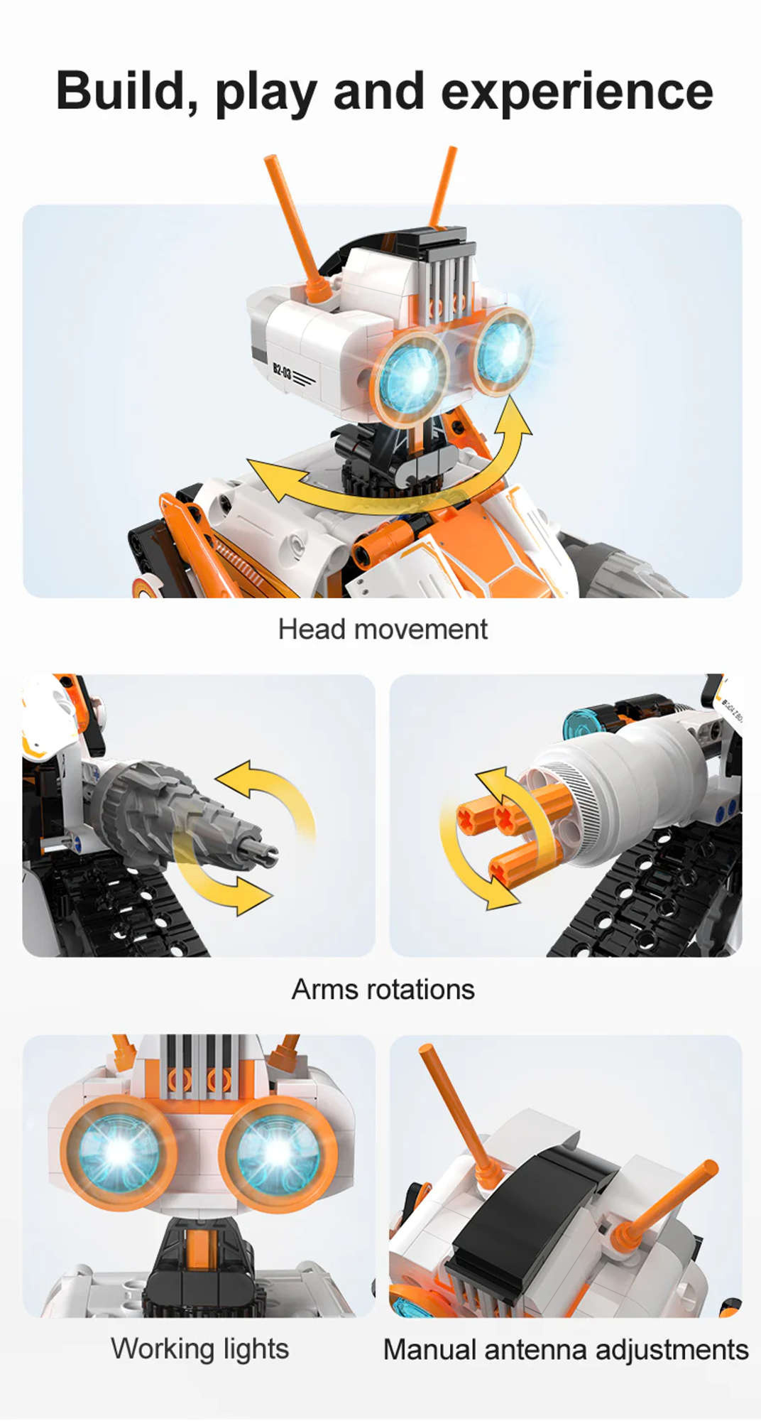• Sestavený robot může řídit a pohybovat končetinami a hlavou a jeho oči svítí světly LED. Robota lze ovládat pomocí dodaného dálkového ovládání