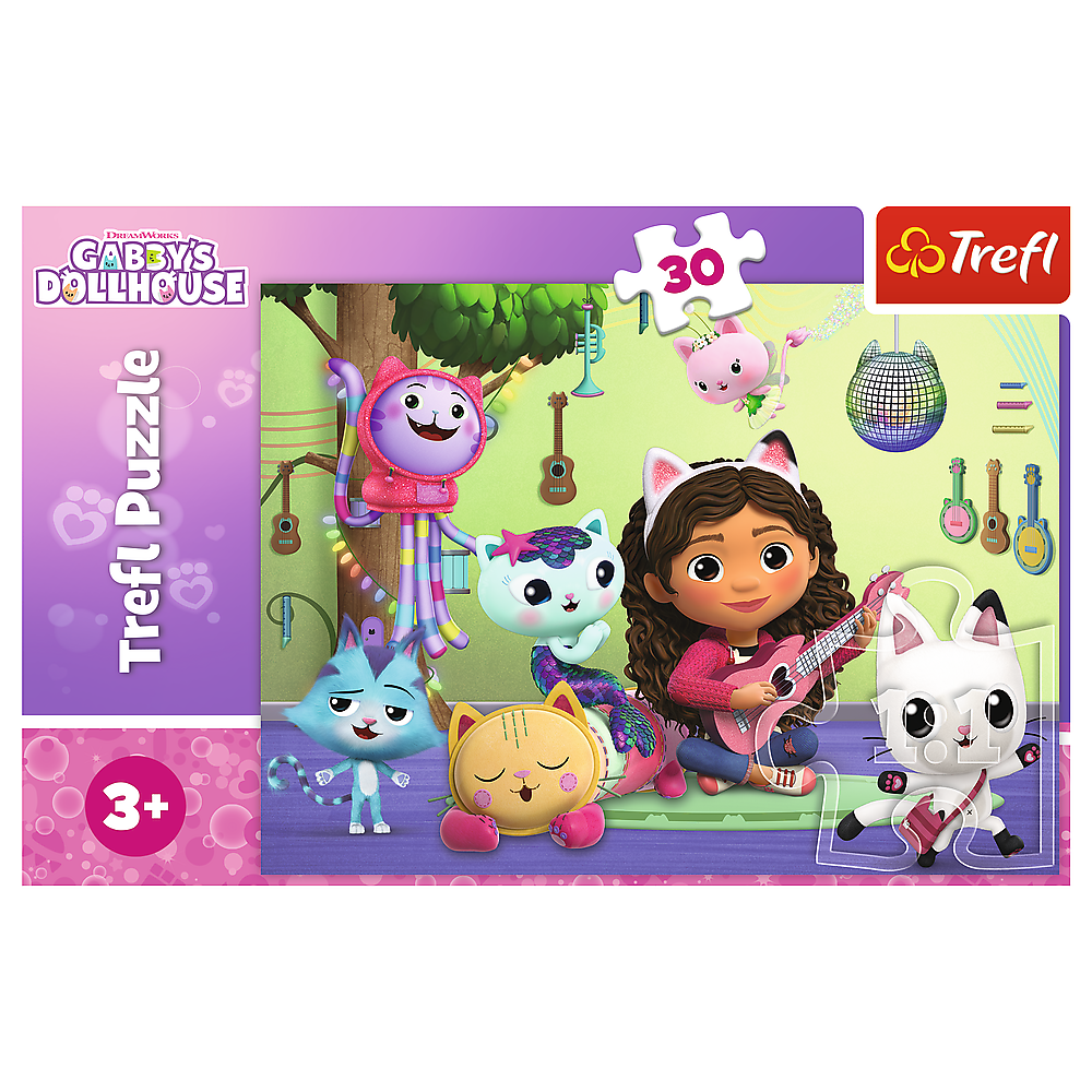 Gabi's Cat House Puzzle se skládá z 30 prvků měření 27 x 20 cm a umožní vám sestavit si obrázek Gabi hraní na kytaru po boku koček, jako jsou: Kittie Panduś, DJ Catnip, Fairy, Mermaid, Najkotek a Softie.