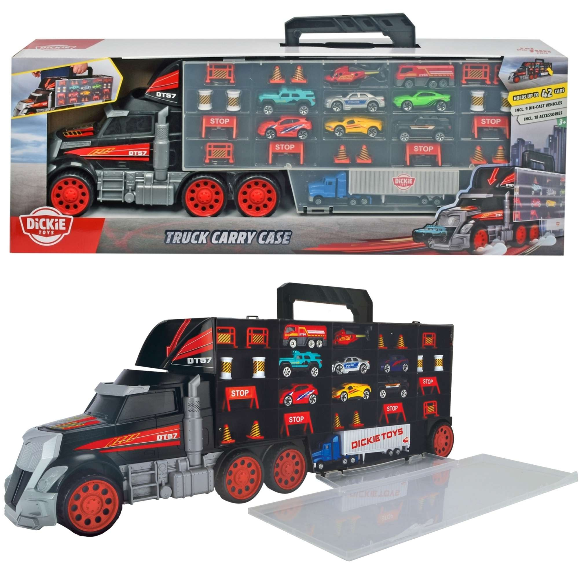 Nákladní automobil, je výjimečný nápad na dárek pro každého malého milovníka aut. Transportér je v černá s červenými a šedými prvky, má adresu pohyblivá kolečka, umožňuje pohyb po rovných plochách a systém bočního otevírání, což usnadňuje vkládání a vyjímání vozů. V transportéru lze uložit až 42 vozů, a samotná oddělení jsou skvěle přizpůsobena potřebám vozu. Její délka je přibližně. 63 cm. Sada obsahuje 18 kusů příslušenství, jako např vrtulník, nákladní automobil,auta i silniční příslušenství.