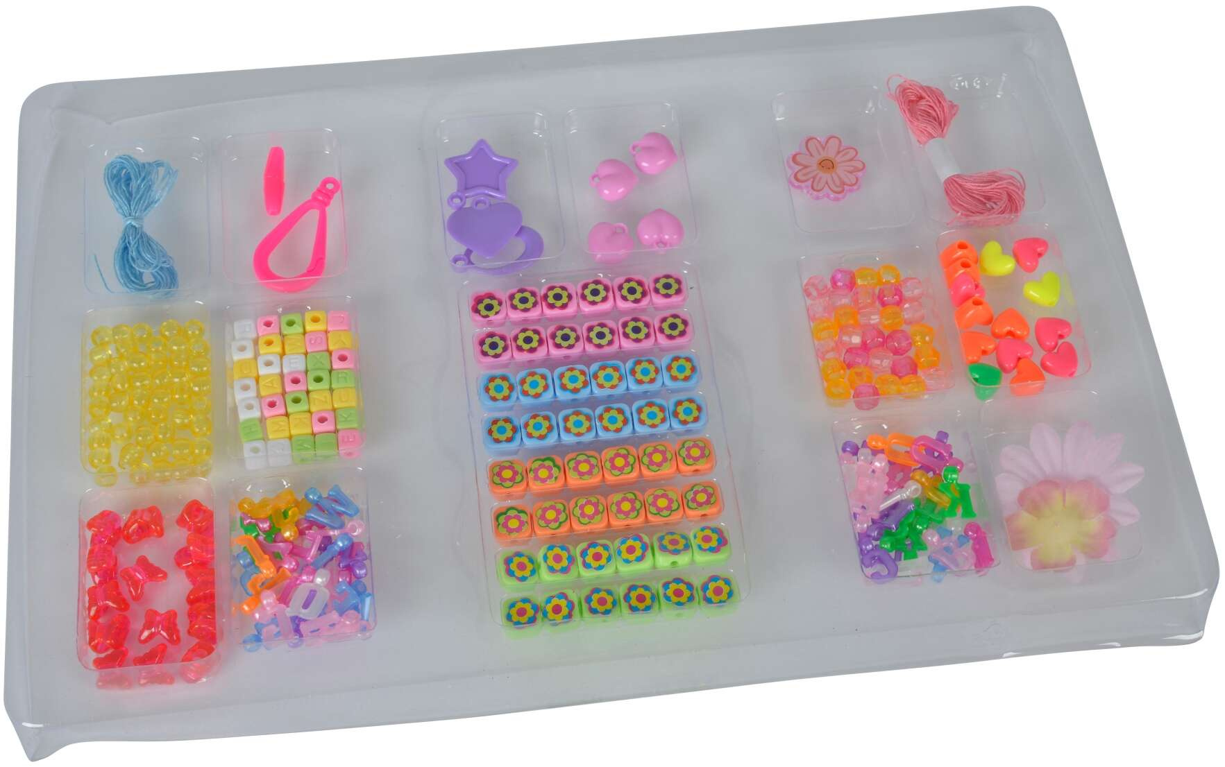 - Sada obsahuje kostky s písmeny a obrázky různých velikostí, písmena, kulaté barevné korálky, šňůrky a další ozdoby a přívěsky, díky kterým budou vytvořené náramky jedinečné.