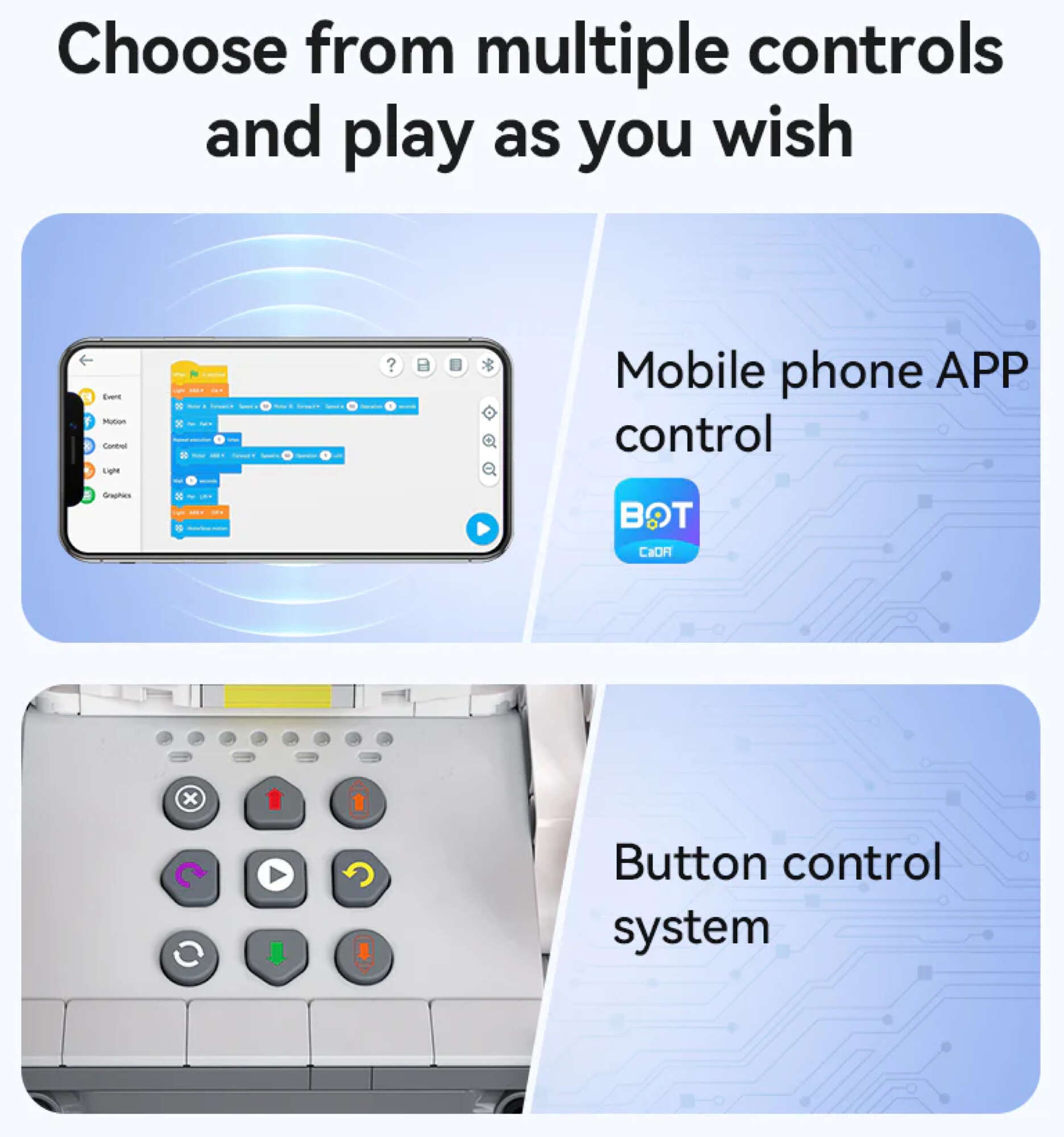 - Produkt s dvojím režimem ovládání: ovládá se pomocí aplikace a ovladače.