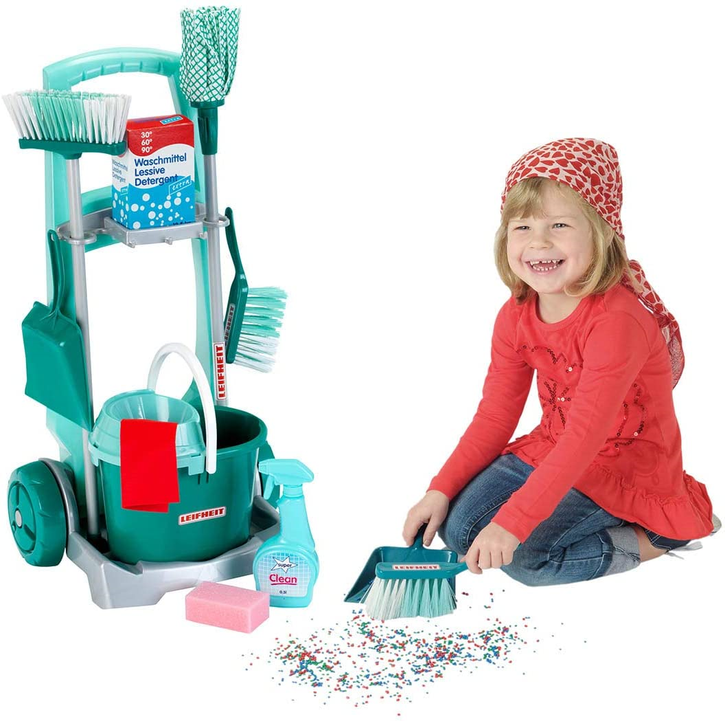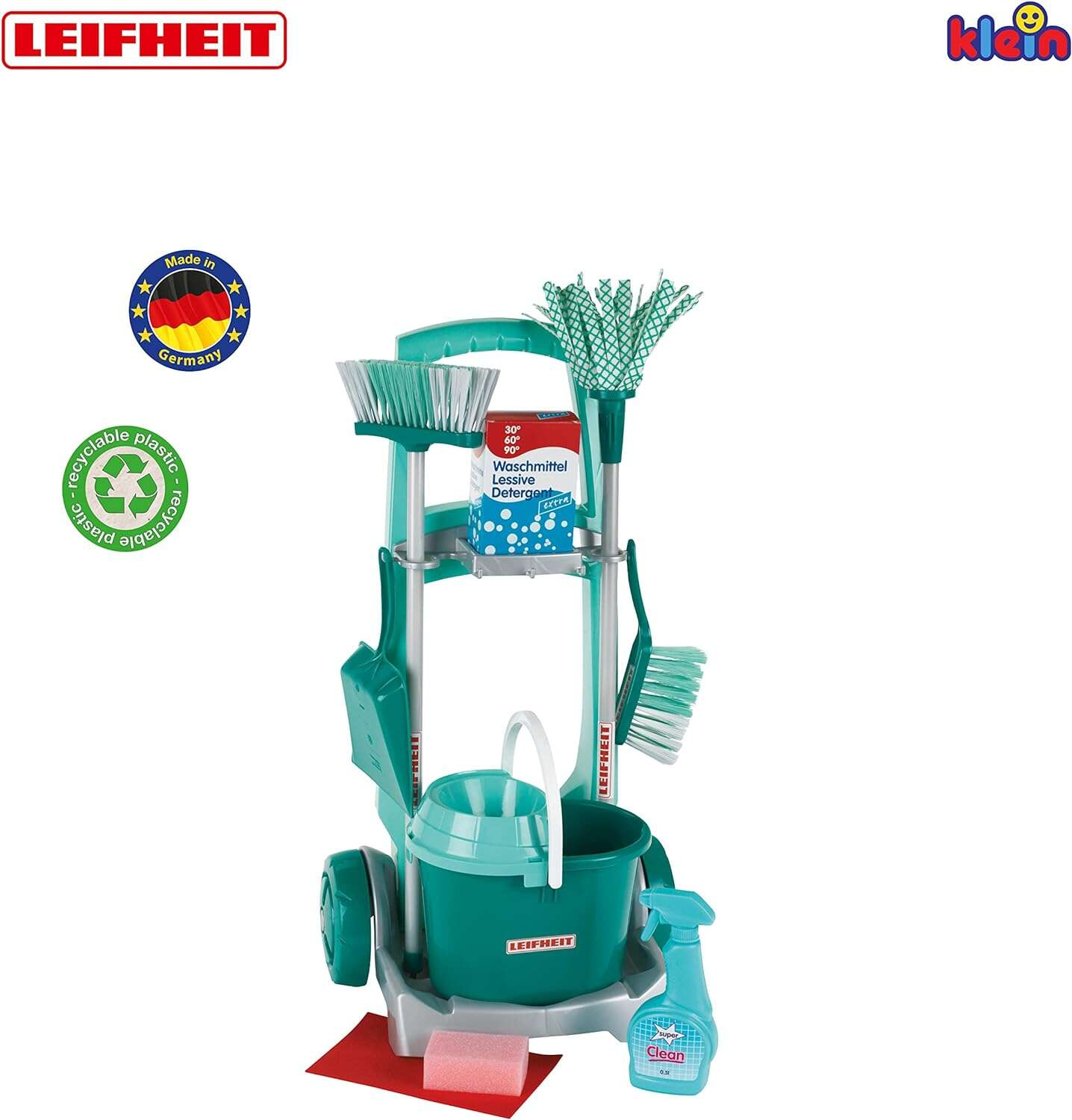 - Hračka je vyráběna v licenci společnosti Leifheit. Sada obsahuje snadno sestavitelný vozík Leifheit a četné příslušenství: koště, smeták, lopatku, mop, kbelík, houbu a další.