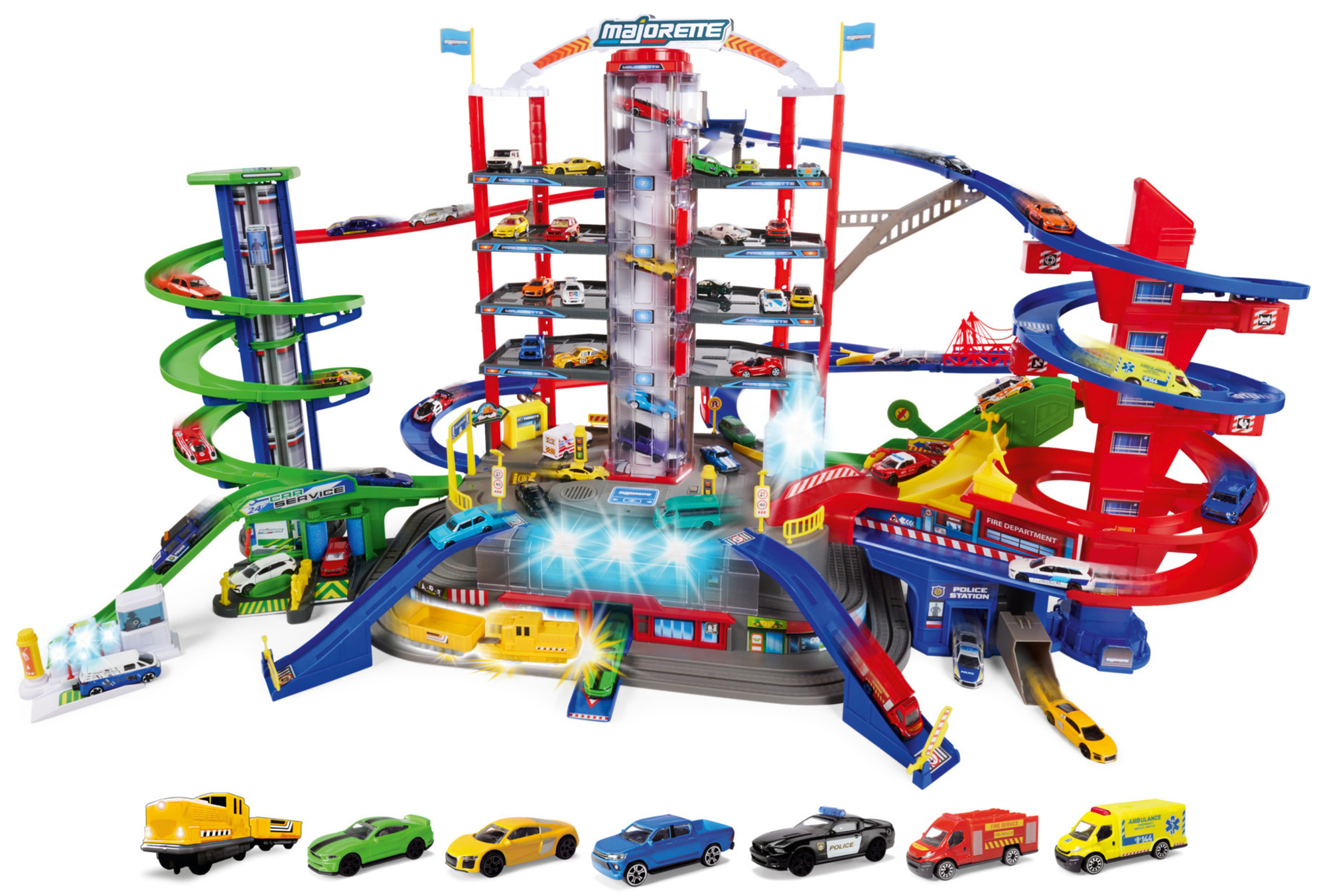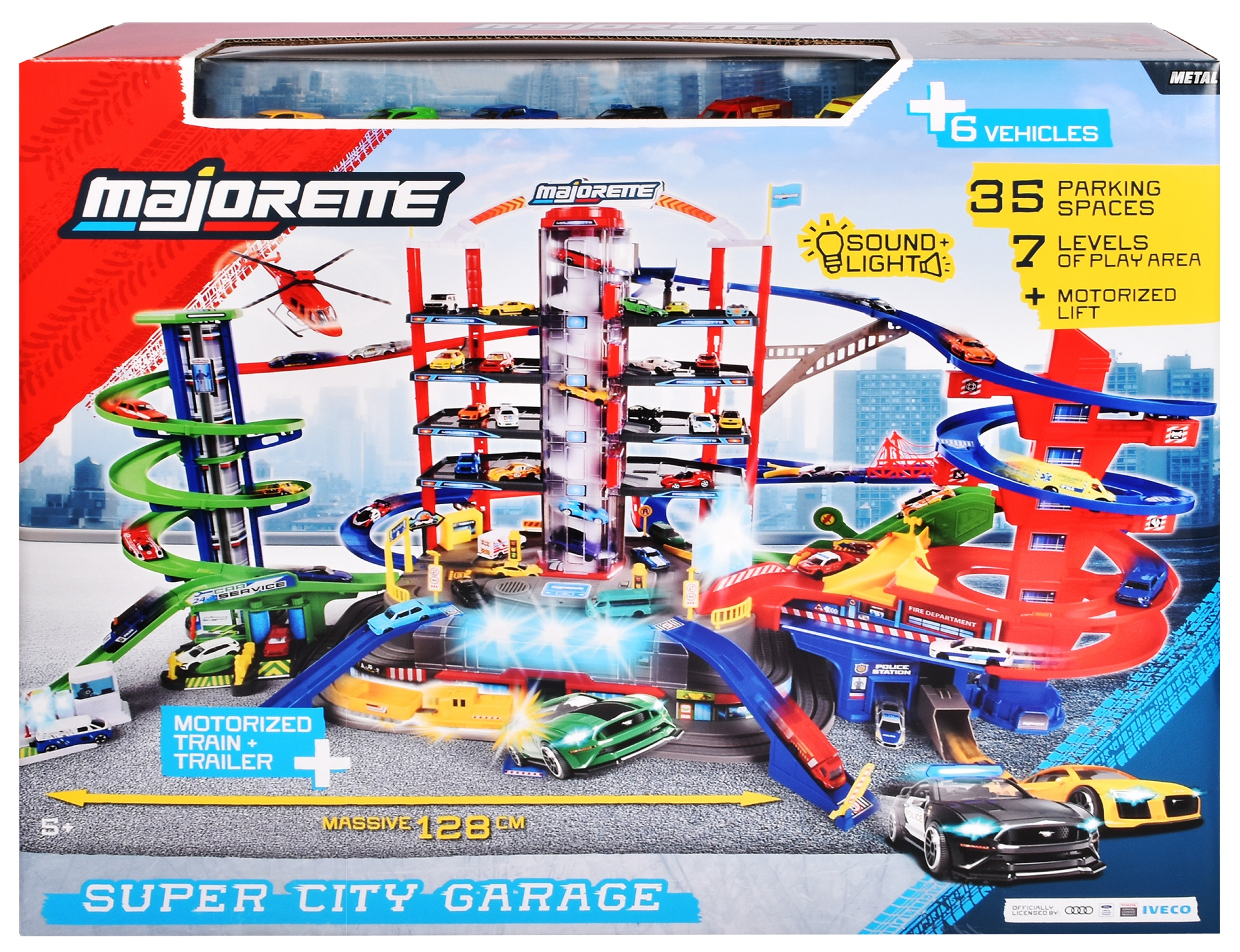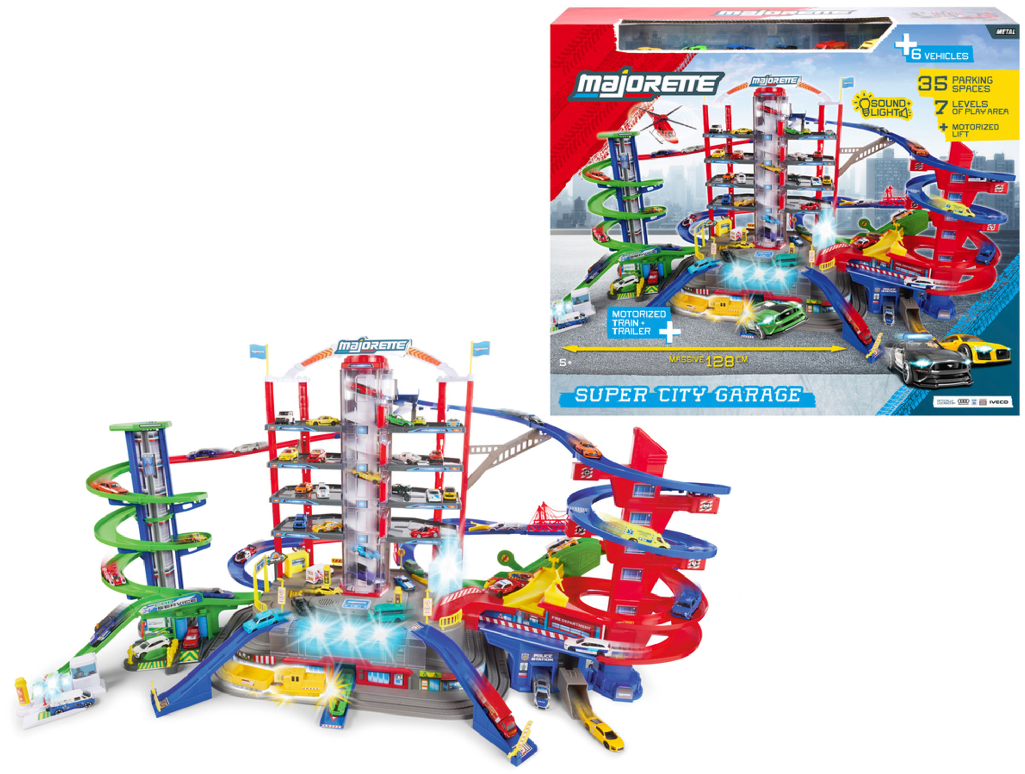 - Garáž Super City, 7 hracích úrovní, 6 připojených autíček (včetně policejního, hasičského a sanitního) a lokomotiva s vagónem. Obsahuje zvukové a světelné efekty. Majorette 21 205 9989