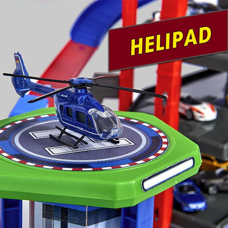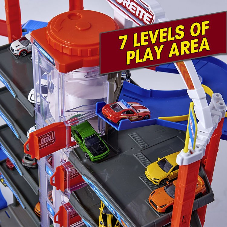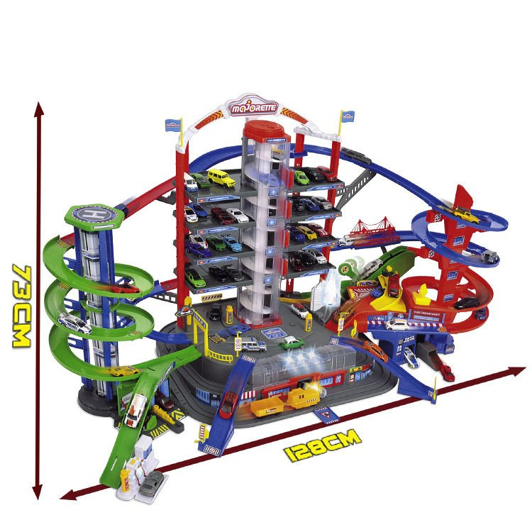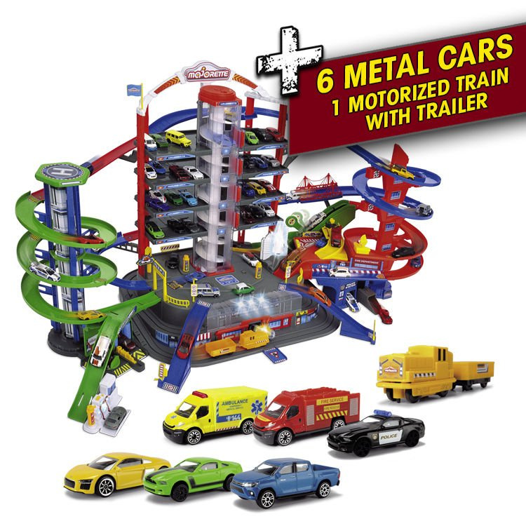GarážSuper City vytvořila známá a vysoce ceněná společnost Majorette. Tato fantastická sada obsahuje 7 úrovní garáže plus 6 autíček a lokomotivu s vagónem.