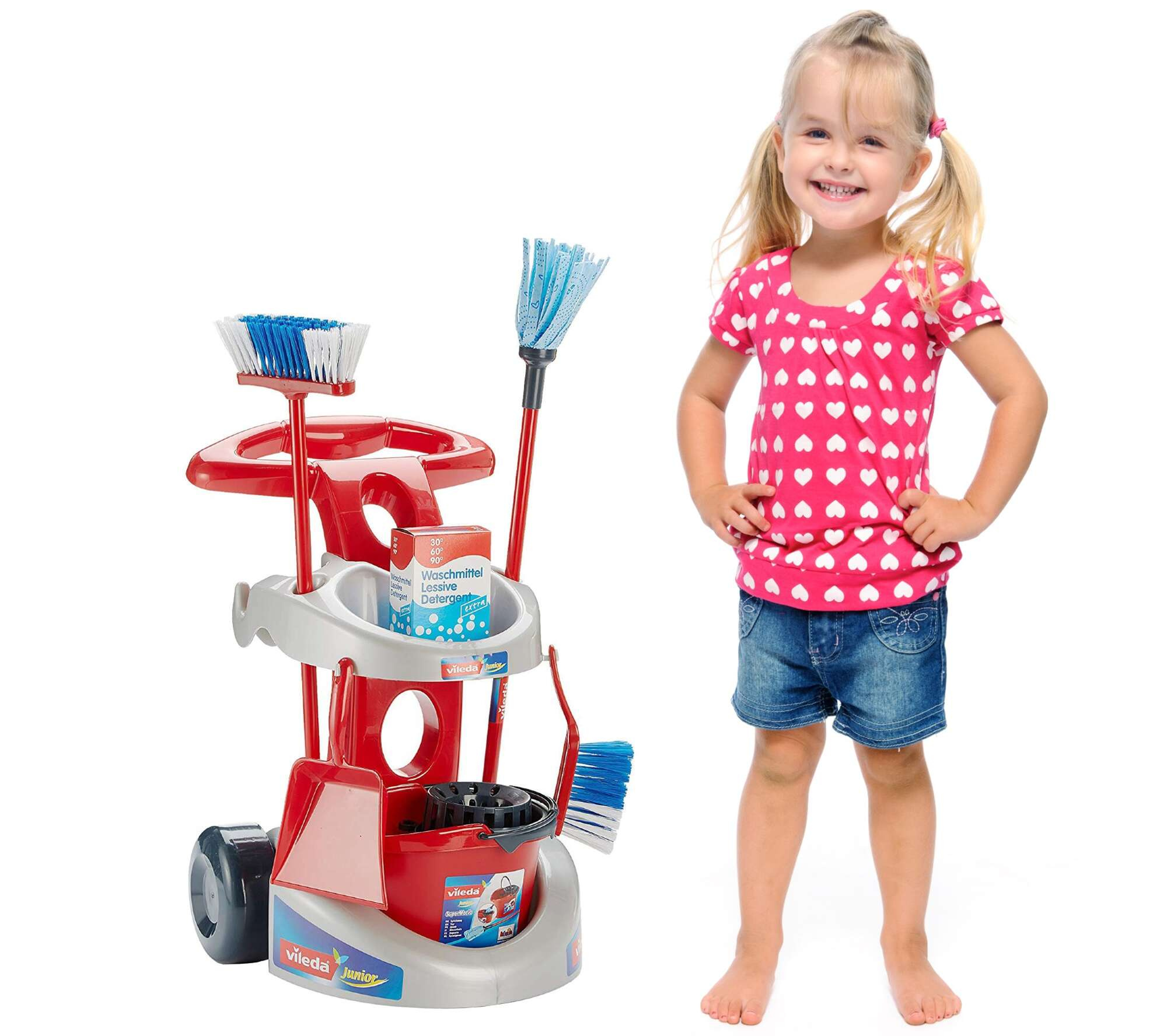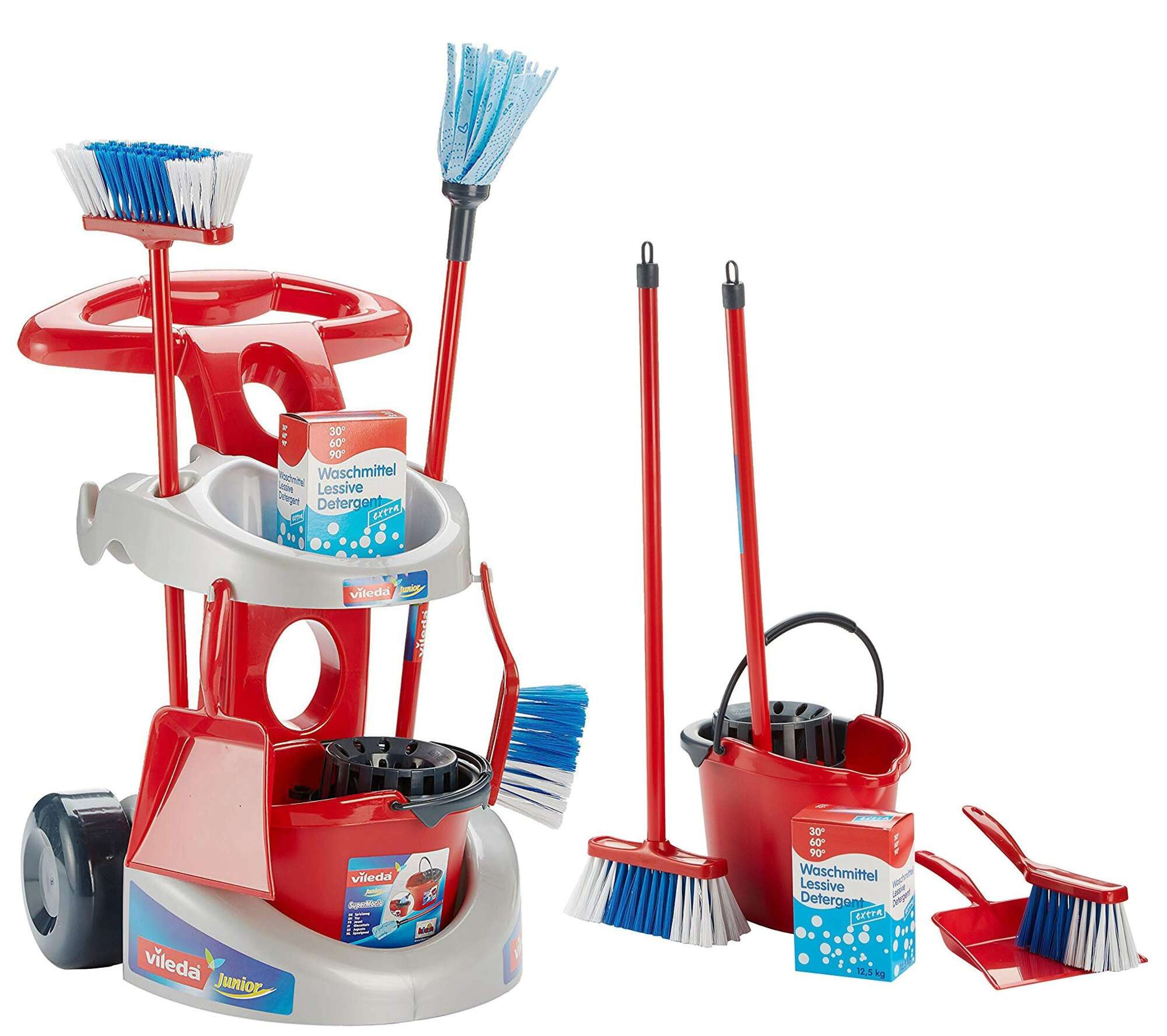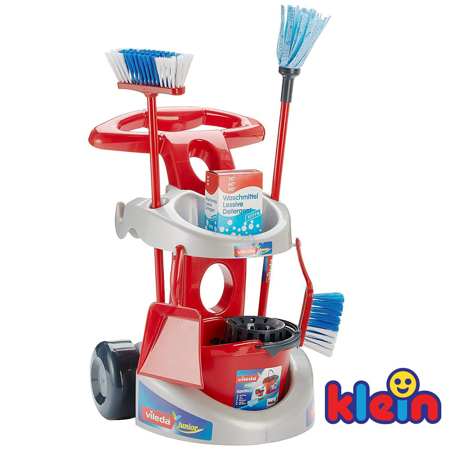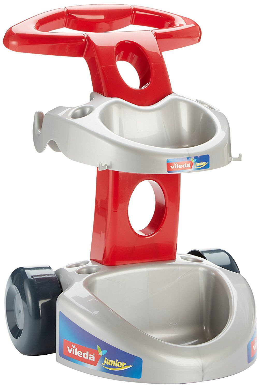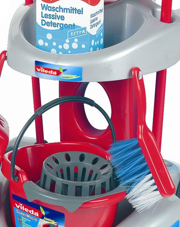 Vyrobeno společností, kterou milují děti a oceňují rodiče Klein, je skvělá sada pro každou malou uklízečku, vytvořená v licenci společnosti Vileda. Hlavním prvkem množiny je šedý a červený vozík z velká černá kola, které usnadňují pohyb po rovných plochách, a červené madlo pro tlačení kočárku. Vozík je vybaven různým příslušenstvím, takže se dítě může zapojit do každodenního úklidu nebo napodobovat rodiče při této činnosti. Zde nalezneme červený kbelík na mop se ždímačem,mop a kartáč na červené tyči, zametač se smetáčkem, a krabice pracího prostředku (figurína). Sada je se snadno sestavuje a vyrobené s důrazem na kvalitu. Veškeré příslušenství, které je součástí balení, jsou mini-verze skutečného úklidového příslušenství, takže dítě může skutečně dělat to, co dělají rodiče. Úklidový vozík Vileda Junior od společnosti Klein je ideální hračkou pro všechny děti, které rády napodobují své rodiče při každodenních činnostech. Rychle se stane oblíbenou hračkou vašeho dítěte.