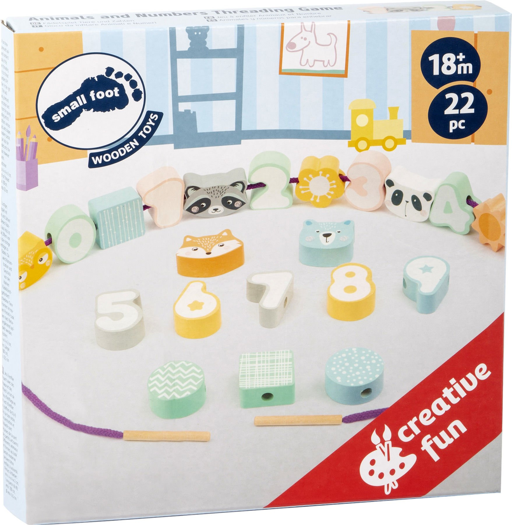 - 21 dřevěných kostek s otvory pro provlékání ve tvaru zvířátek (například liška, panda nebo sova), čísla (od 0 do 9) a další tvary (čtverce nebo kruhy).